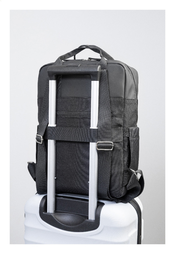RPET hátizsák puha PU bőr felsőrésszel, cipzáras rekesszel, cipzáras elülső zsebbel, oldalsó zsebekkel és lopásgátló zsebbel. Bőrönd pánttal, párnázott hátrésszel és laptop rekesszel (15). 900D RPET poliészter, megkülönböztető RPET címkével. RPET non-woven zsákban."