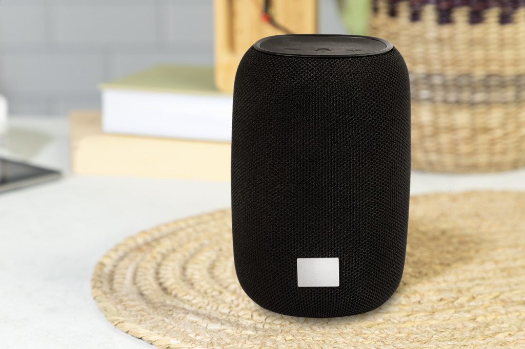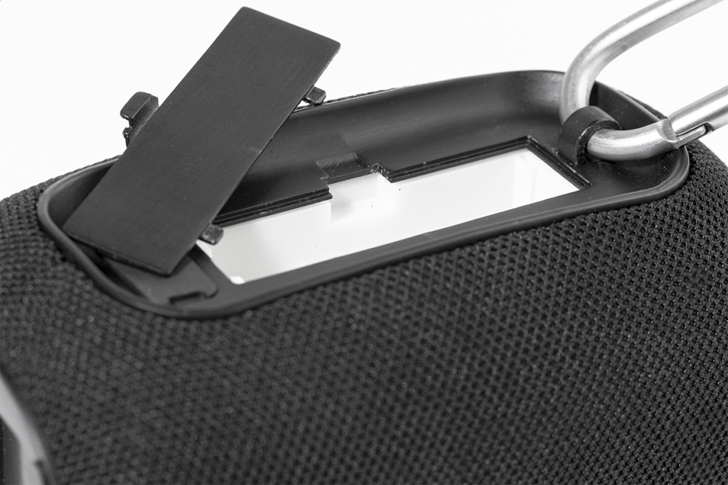 Újrahasznosított ABS vezeték nélküli hangszóró RPET poliészter hálóval, alumínium karabinerrel és fém logóval. Beépített újratölthető akkumulátorral (1800 mAh). USB töltőkábellel.
