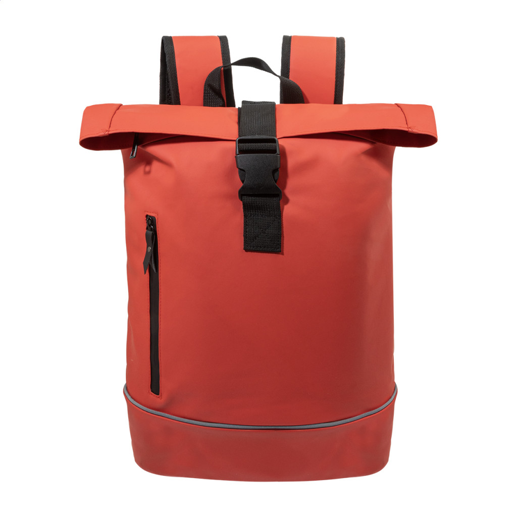 Vízálló, puha, újrahasznosított PU műbőrből készült rolltop hátizsák cipzáras, csattal záródó fő rekesszel, vízálló cipzáras elülső zsebbel, párnázott laptop (15) rekesszel és fényvisszaverő csíkkal. Párnázott hátrésszel és vállpántokkal. Megkülönböztető újrahasznosított PU címkével. A termék kizárólag promóciós célra alkalmas, nem minősül egyéni védőfelszerelésnek."
