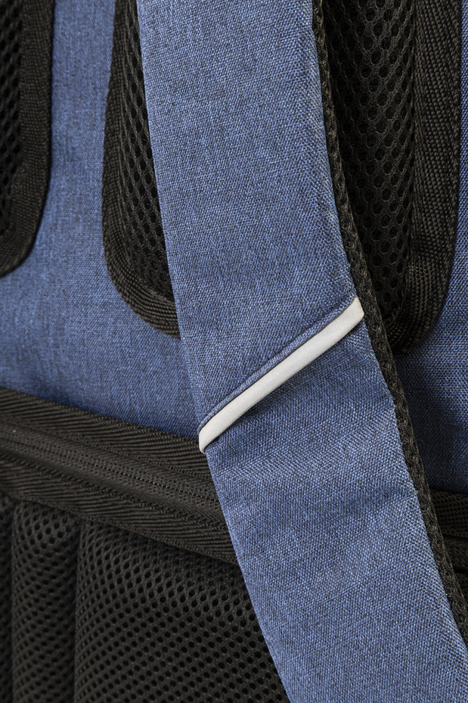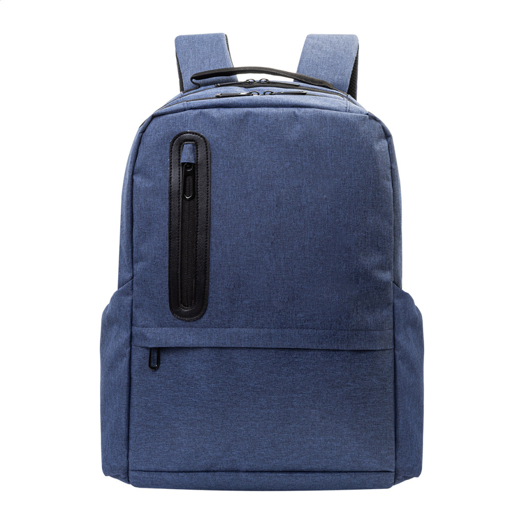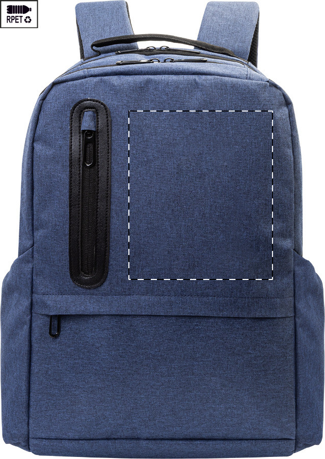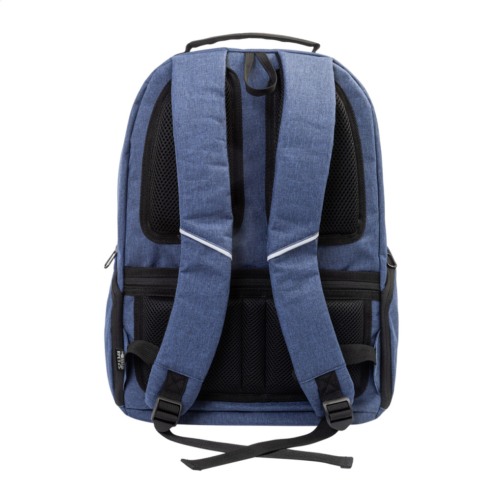 RPET hátizsák cipzáras rekeszekkel, 2 cipzáras elülső zsebbel, cipzáras oldalsó zsebekkel és párnázott laptop rekesszel (15-os). Párnázott hát- és vállpántokkal, lopásgátló zsebbel és bőrönd pánttal. 300D RPET poliészterből, megkülönböztető RPET címkével."