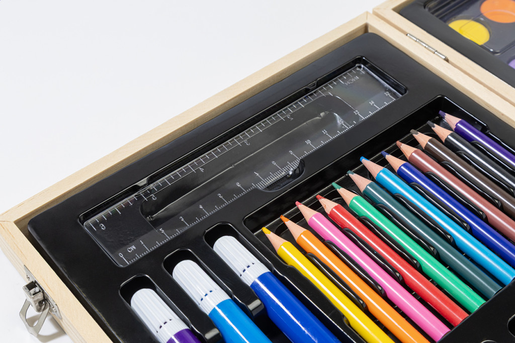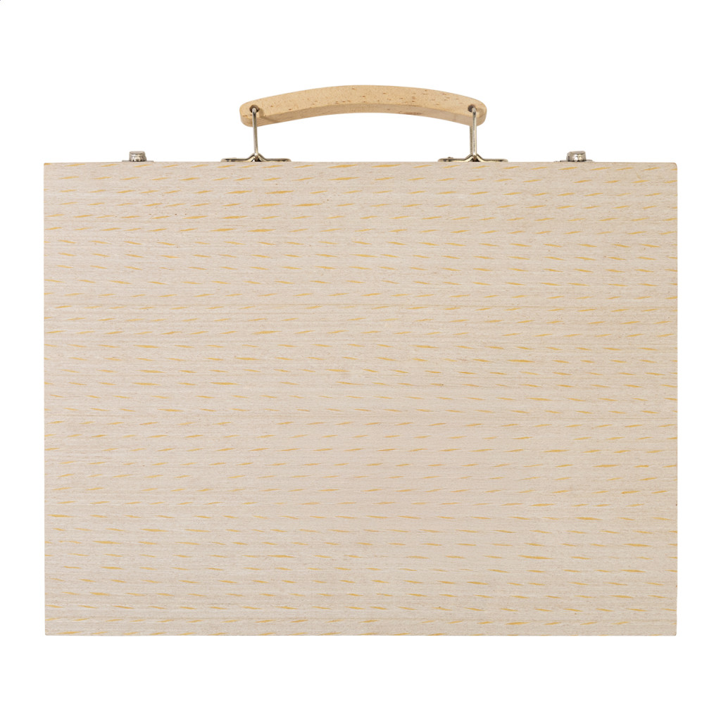 Átfogó, 66 darabos művész rajz- és festőkészlet fa dobozban. Tartalma: 12 zsírkréta, 12 olajpasztell kréta, 12 ceruza, 12 filctoll, 12 akvarellfesték palettával és ecsettel, vonalzó, radír, hegyező és ragasztó.
