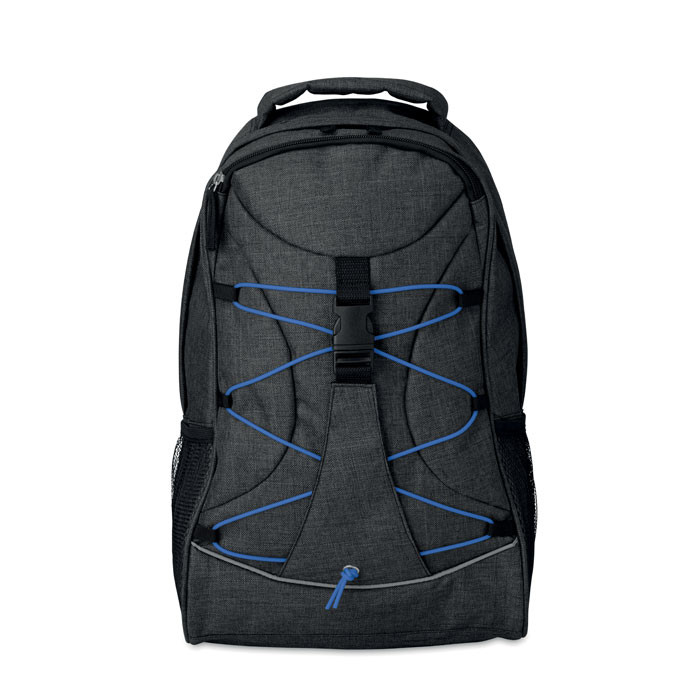 600D melírozott poliészter hátizsák színes kontrasztos elemekkel, az elején sötétben világító zsinórral. Mindkét oldalán hálós zsebekkel.