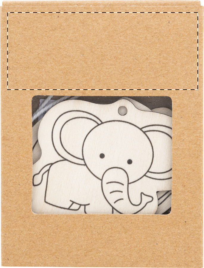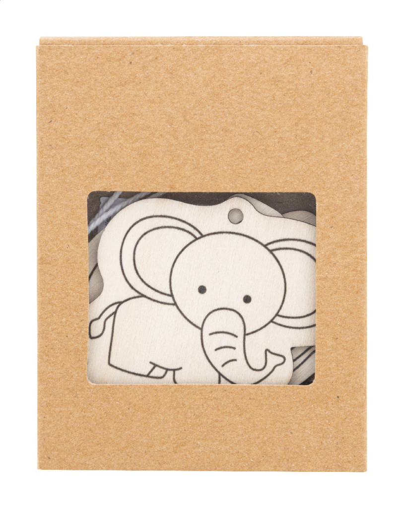 3 darabos fa állatfigurás színező szett, 4 db fa színes ceruzával és akasztózsinórral. Kraft papír dobozban.
