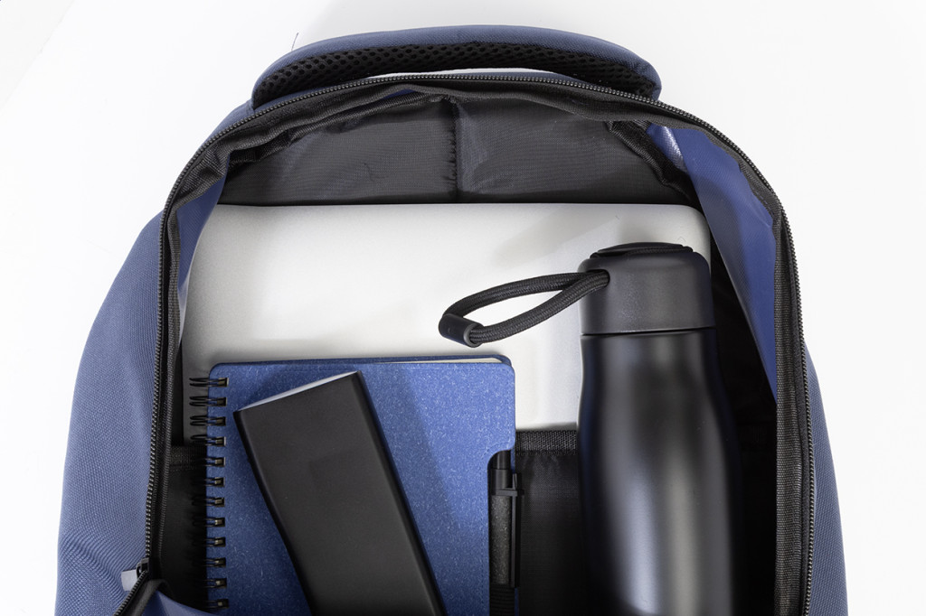 RPET kültéri hátizsák cipzáras rekeszekkel és elülső zsebbel, párnázott laptop rekesszel (15), hálós oldalsó zsebekkel és elöl rugalmas zsinórokkal. Párnázott hátrésszel és vállpántokkal. 600D RPET poliészterből, megkülönböztető RPET címkével."