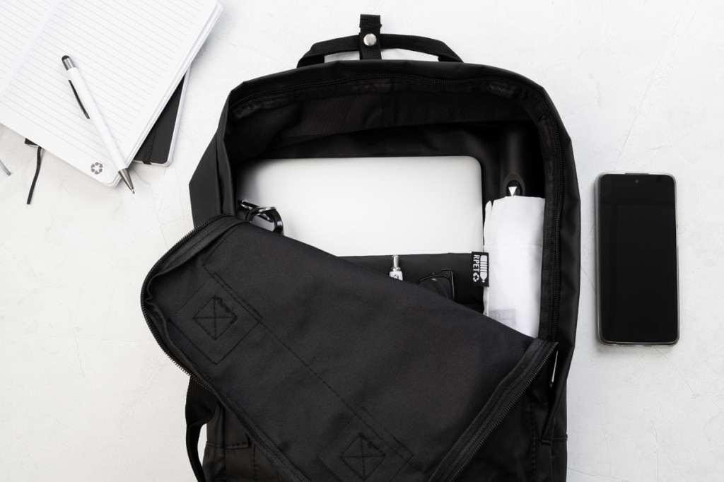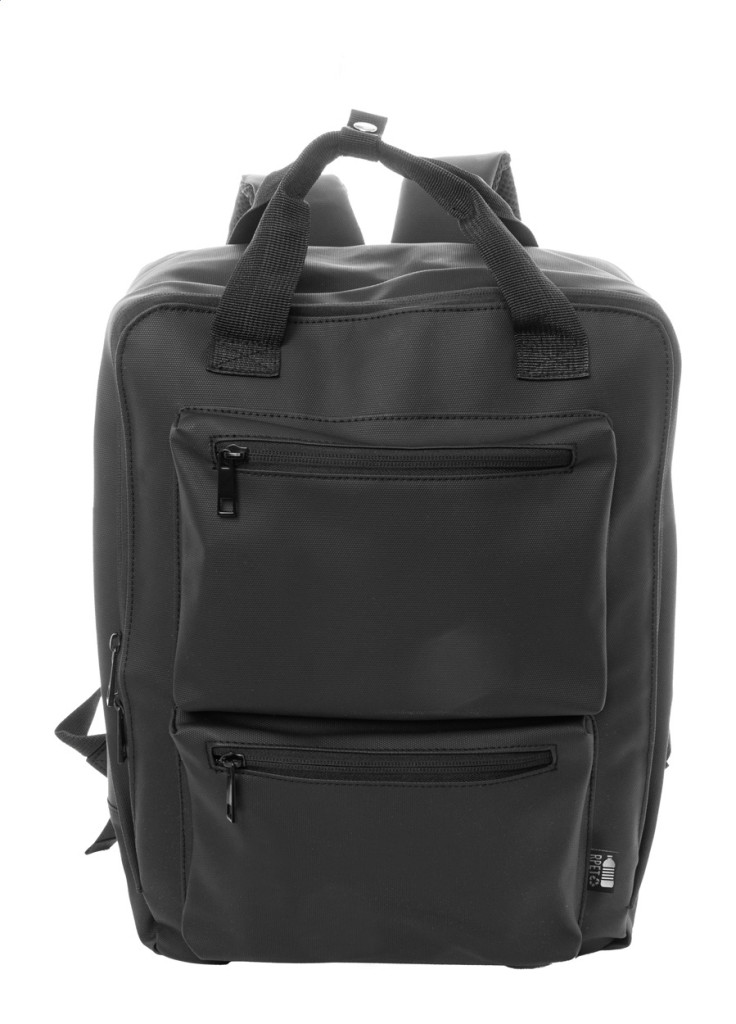 Vízálló RPET hátizsák cipzáras fő rekesszel, 2 cipzáras első zsebbel, oldalzsebekkel és párnázott laptop (15) és tablet (10") rekesszel. Párnázott hát- és vállpántokkal. PU bevonatú 600D RPET poliészter, megkülönböztető RPET címkével."