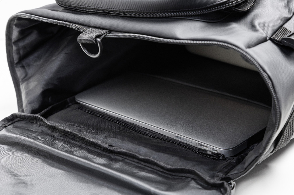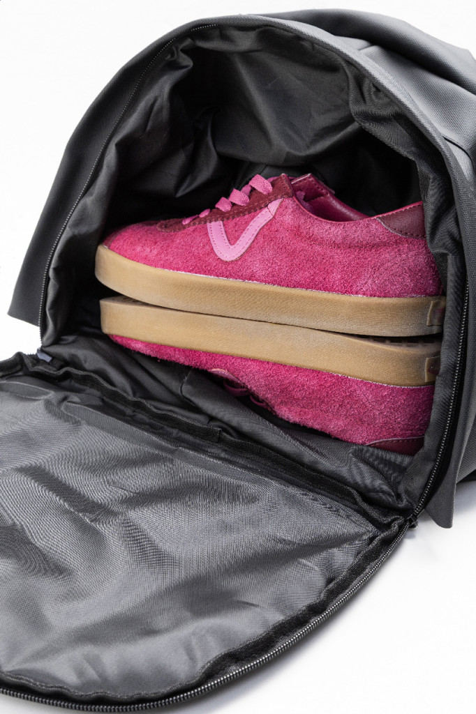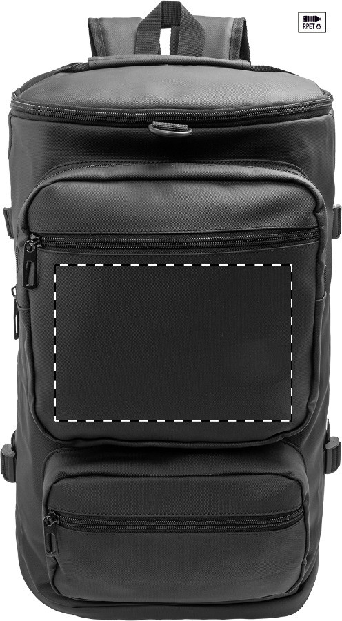 Vízálló RPET hátizsák cipzáras fő rekesszel, 2 cipzáras elülső zsebbel, oldalsó zsebekkel és cipőtartó rekesszel. Párnázott laptop rekesszel (15), párnázott hátrésszel és vállpántokkal. Méretre állítható oldalsó pántokkal. PU bevonatú 600D RPET poliészter, megkülönböztető RPET címkével."