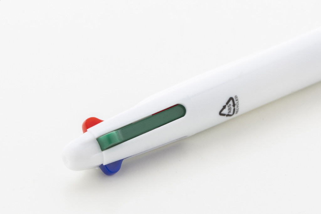 Újrahasznosított ABS műanyag, többszínű golyóstoll gumi markolattal. Fekete, kék, piros és zöld tollbetéttel.