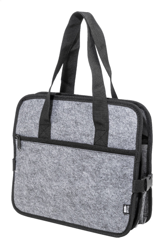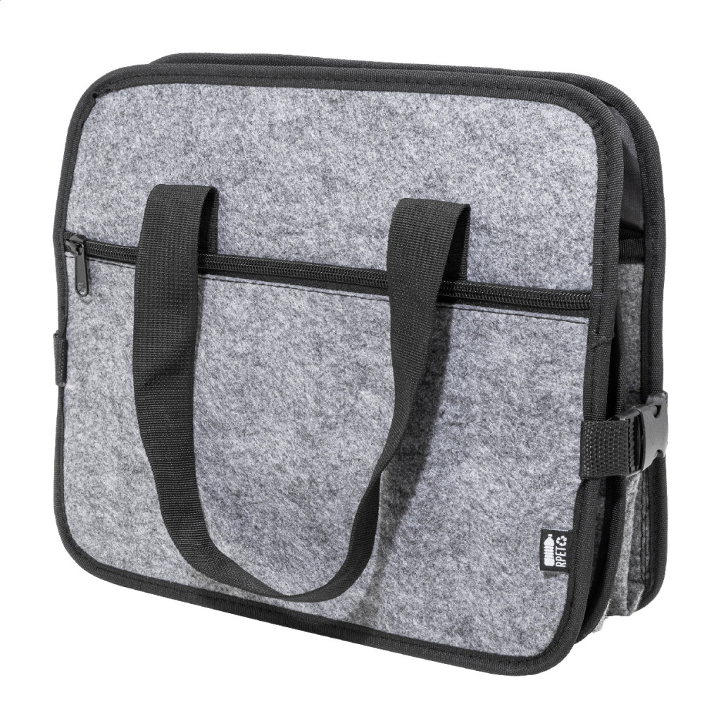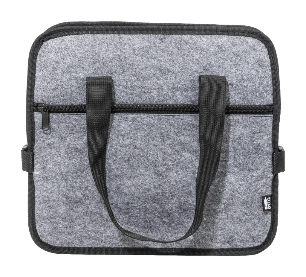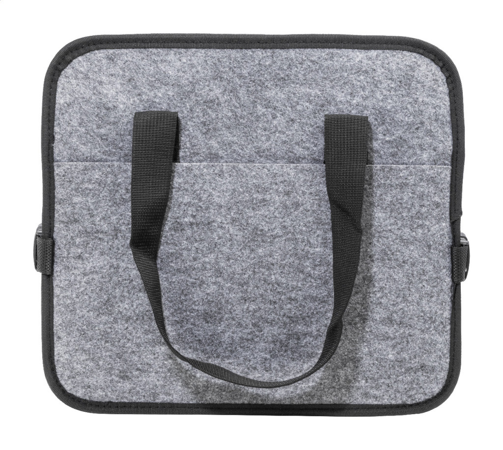 Összecsukható, RPET filcből készült autós csomagtartó-rendszerező cipzáras elülső zsebbel, hosszú fogantyúkkal és oldalsó csatokkal a kényelmes tárolás érdekében. Nyitott tárolórekesszel és egy cipzáras hűtőrekesszel, alumínium béléssel. Megkülönböztető RPET címkével.