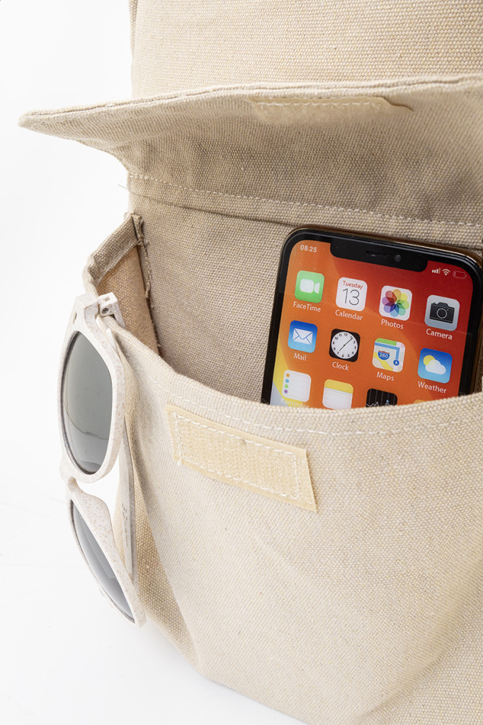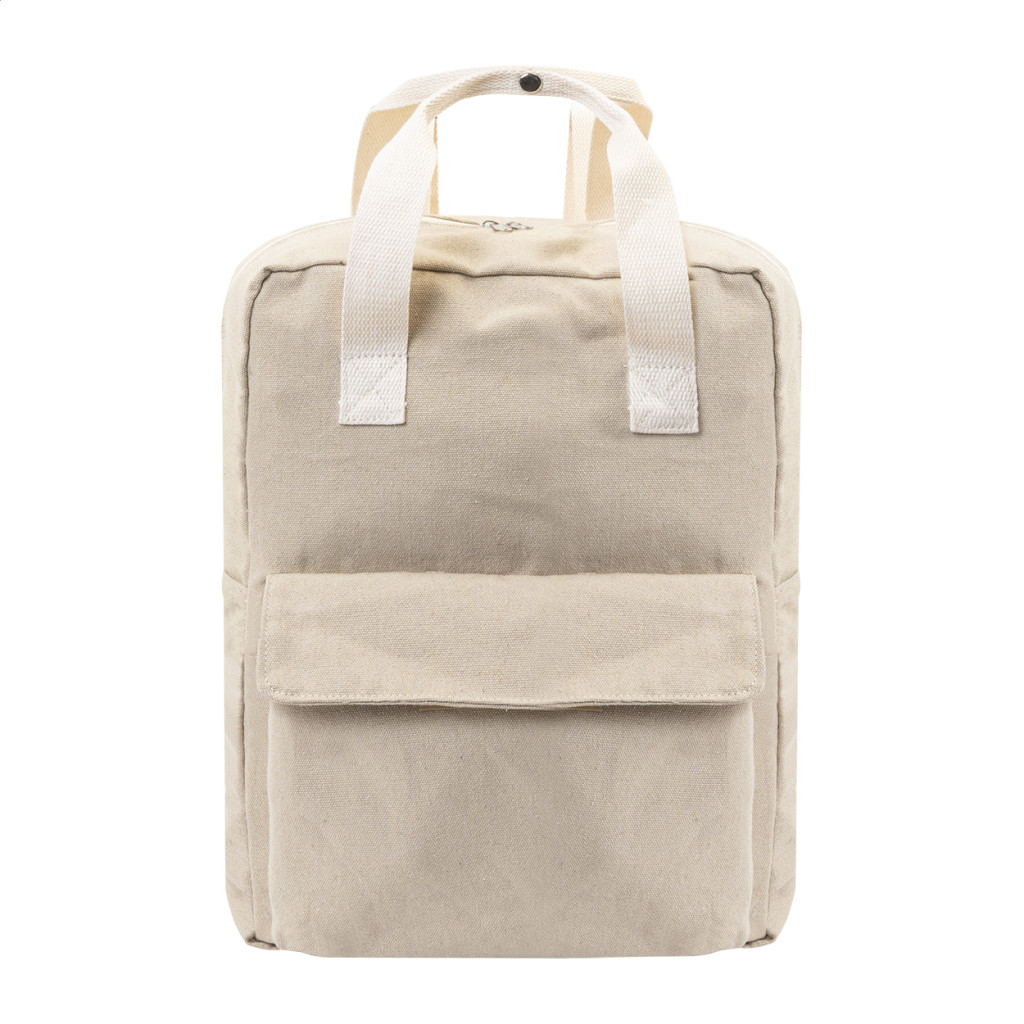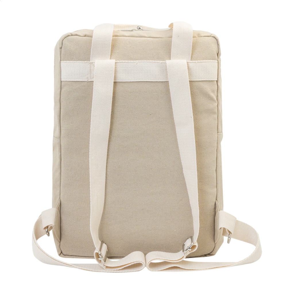 Újrahasznosított vászon hátizsák cipzáras fő rekesszel, párnázott laptop rekesszel (13) és tépőzáras elülső zsebbel. 70% újrahasznosított pamut és 30% RPET poliészter. Megkülönböztető újrahasznosított pamut címkével."