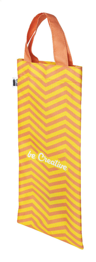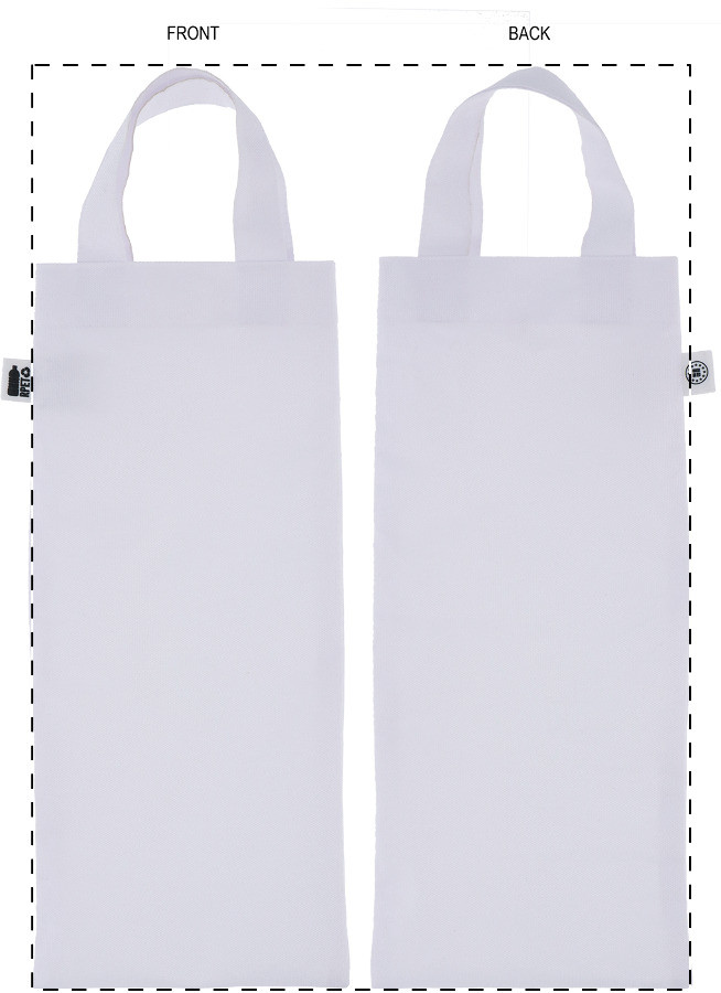 Egyedi gyártású, 600D RPET poliészter boros tasak rövid fülekkel. Teljes felületén szublimációs grafikával és megkülönböztető RPET címkével. Minimális rendelési mennyiség: 25 db.