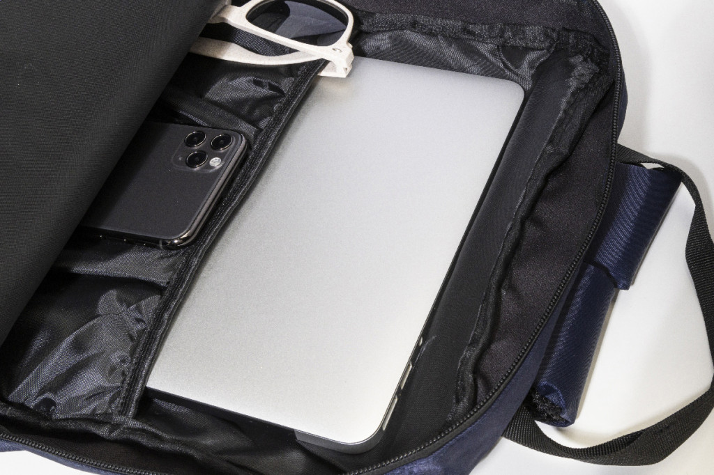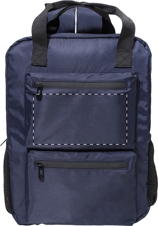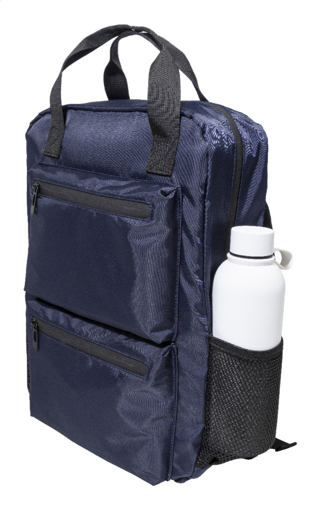 RPET hátizsák cipzáras rekesszel, 2 cipzáras elülső zsebbel, párnázott laptop rekesszel (15) és hálós oldalsó zsebekkel. Párnázott hát- és vállpántokkal, lopásgátló zsebbel és bőrönd pánttal. RPET twill poliészter, megkülönböztető RPET címkével."